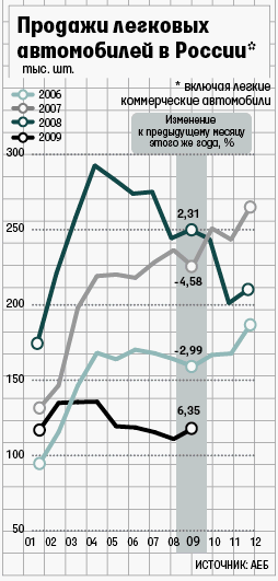 За сентябрь в России продан 117 981 легковой и легкий коммерческий автомобиль. Это на 52% меньше, чем в сентябре 2008 г., но на 6% (7074 машины) больше, чем в августе, сообщил комитет автопроизводителей Ассоциации европейского бизнеса. Правда, падение продаж в России остается самым сильным среди 15 крупнейших рынков мира.
