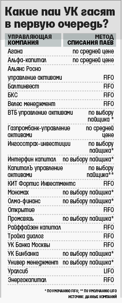 Многие УК дают право пайщикам самим выбирать, какой пакет гасить первым (см. таблицу). «Пайщик должен выбрать метод списания паев при первом погашении в течение года, а изменить его можно будет только в следующем году», – подчеркивает руководитель подразделения из УК «Универ менеджмент» Ирина Новикова. Право выбора пайщикам также предоставляют «ВТБ управление активами», «Ингосстрах-инвестиции», «Интерфин капитал», «Промсвязь», «Капиталъ управление активами», УК Бинбанка, «Мономах». Если пайщик не сделал выбор, компания по умолчанию будет использовать метод FIFO или LIFO.