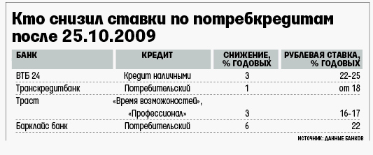 Вслед за автокредитами и ипотекой банки стали активно улучшать условия по кредитам наличными и необеспеченным потребкредитам. Только на этой неделе подешевели кредиты «ВТБ 24», НБ «Траст», Транскредитбанка (для работников РЖД), «Барклайс банка» (см. таблицу). А за последний месяц ставки таких кредитов снизили «Возрождение» (на 3–5,5 процентного пункта), Райффайзенбанк (на 3 п. п.), «Юникредит банк» (на 3 п. п.), Банк Москвы (на 10 п. п.), Инвестторгбанк (в среднем на 1 п. п. для кредитов на срок от 2 лет), Соцгорбанк (на 3 п. п.). В ближайшее время снизить процентные ставки по потребкредитам, а также банковским картам планируют в «Юниаструм банке», сообщили в пресс-службе. Величина снижения пока не установлена.