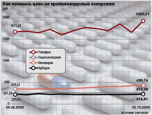 Несмотря на ажиотаж, цены на противовирусные лекарства пока не растут, отмечает в своем отчете DSM Group. «Существенное увеличение розничной цены в сентябре – октябре можно отметить только у ингавирина – в среднем с 370 по 415 руб. Стоимость арбидола не растет, тамифлю подорожал в среднем на 5%», – подсчитали аналитики агентства. Представители «Фармстандарта», «Валенты» и Roche сообщили, что отпускную цену на препарат не меняли.