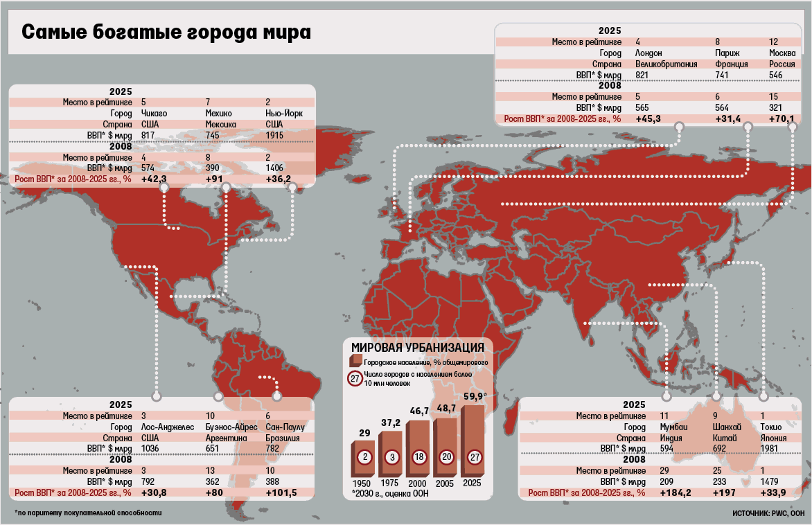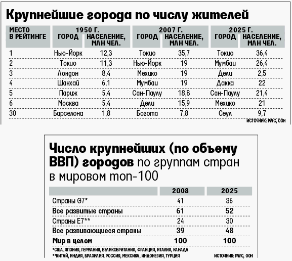 Рычаги развития глобальной экономики перемещаются в города, где концентрируется международная активность, замечают Джон Хоксворт, Томас Хоен и Анмол Тивари из PricewaterhouseCoopers (PwC) в докладе о развитии крупнейших городов мира к 2025 г. В 2005 г. на долю сотни крупнейших городов приходилось 25% мирового ВВП, в 2008 г. – 30%. В ближайшие 15 лет «экономическая карта мира» заметно изменится: к таким традиционным мировым центрам, как Нью-Йорк, Токио, Лондон, приблизятся Мехико, Сан-Паулу, Шанхай, Мумбаи (см. инфографику на стр. А3).