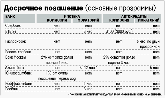 Моратории и комиссии (фактически штрафы) на досрочное погашение и сегодня не очень популярны у крупнейших российских банков (см. таблицу): у Сбербанка, Россельхозбанка их по основным ипотечным и автокредитным программам вовсе нет, у остальных есть, но они действуют 3–12 месяцев. Однако так быстро ипотеку обычно никто и не гасит, отмечает член правления Райффайзенбанка Андрей Степаненко.