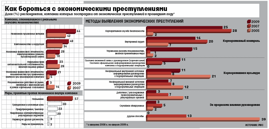 В 2007 г., когда PwC проводила предыдущее исследование, с преступлениями столкнулись 59% российских компаний, но Россия и тогда заняла первое место в мировом рэнкинге (в 2005 г. Россия тоже была впереди всех). А в 2003 г., когда исследование в России проводилось впервые, никто не признался, что стал жертвой мошенничества, замечает его соавтор Ирина Новикова: теперь настали другие времена – компании уже не боятся говорить о своих проблемах.