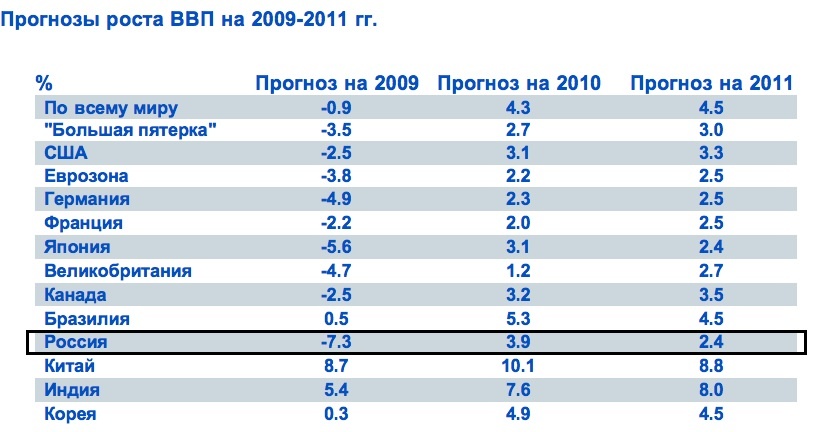 Одна из основных проблем 2010 г. - постепенное сворачивание программ господдержки без потрясений для рынков и экономики. Аналитики ждут слабого роста ставки ФРС США - до 0,2% к концу следующего года. Евросоюз будет более агрессивен - эксперты прогнозируют ставку на уровне 2,5%. Рост мировой экономики в следующем году составит 4,3%, после почти 1%-ного падения в 2009 г. Процесс оздоровления будет особенно заметен в Китае и Индии, где ВВП увеличится примерно на 10% и 7% соответственно. Рост ВВП в России в 2010 г. составит 3,9%, в 2011 г. - 2,4%. По итогам текущего года аналитики ожидают спад в стране на 7,3%.