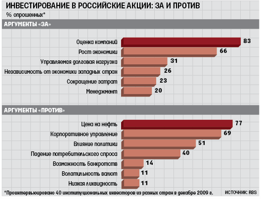 В 2009 г. индекс РТС вырос на 128%, оставив позади все развитые и развивающиеся рынки за исключением Бразилии, рынок которой вырос на 145%. На экономику больше всего будут влиять цены на нефть (89%), мировые рынки (69%), курс рубля (43%) и политика государства (23%), считают респонденты RBS. 76% опрошенных ожидают, что рост ВВП в этом году превысит 3–5%, 12% – роста более 5%. 48% респондентов прогнозируют, что курс в конце года будет на уровне 25–30 руб./$, а 34% – 30 руб./$ (официальный курс ЦБ на сегодня – 29,42 руб./$).