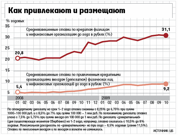 В этом году средняя ставка по вкладам тоже будет примерно на 1 процентный пункт выше инфляции, прогнозирует член правления «ВТБ 24» Георгий Горшков (официальный прогноз Минэкономики по инфляции на 2010 г. – 7,5%). В январе сочетание таких факторов, как спрос населения на вклады, инфляция и маржа, точно позволит «ВТБ 24» держать ставки на нынешнем уровне (8,5–10,5% по вкладам на 6–13 месяцев), но многие банки из топ-30, где еще сохранились предложения с доходностью 14–15% годовых, вынуждены будут в ближайшее время от них отказаться. Горшков также ожидает роста рынка кредитов населению в этом году на 10–25%.