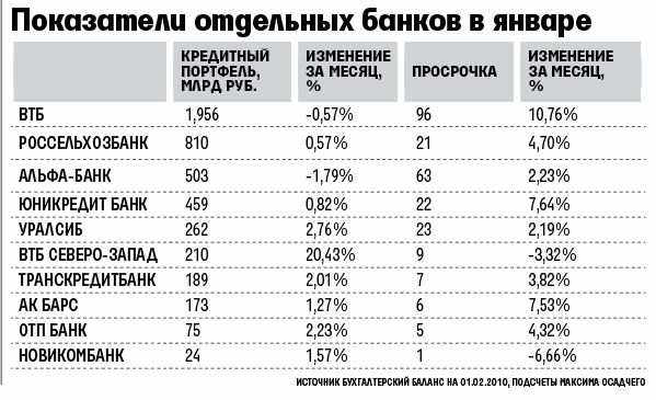 Руководители ЦБ недаром ждали в этом году оживления кредитования: в январе многие банки увеличили портфели на 1–2%У большинства банков, отчетность которых за январь уже доступна, остатки ссудной задолженности начали расти (см. таблицу). Снижались они только у крупнейших банков: ВТБ сократил кредитный портфель на 0,6% и увеличил просрочку на 10,8%. Похожая динамика у Альфа-банка, хотя его представители поставили цель наращивать портфель и снижать просрочку и уверяли, что это произойдет в ближайшем будущем.