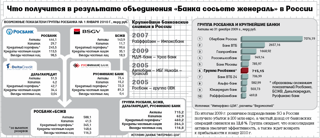 Росбанк присоединит «Банк сосьете женераль Восток» (БСЖВ) и одновременно купит у SG ипотечный банк «Дельтакредит» и «Русфинанс банк», специализирующийся на потребительских и автокредитах. Они станут 100%-ными «дочками» обновленного Росбанка, рассказала заместитель гендиректора «Интерроса» Лариса Зелькова. Что будет с их брендами, еще не решено, говорит она, но уже понятно, что главным брендом станет Росбанк. Объединение займет примерно год, ожидает «Интеррос».