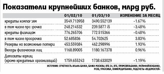 Большинству ведущих российских банков в феврале не удалось увеличить кредитные портфели, свидетельствует опубликованная ими отчетность. У девяти из топ-13 по активам банков (без Сбербанка, Газпромбанка, Росбанка и МДМ-банка) совокупный корпоративный портфель уменьшился за февраль на 2%, розничный – на 0,5%. За это же время просроченной задолженности стало меньше на 3,5% по корпоративным кредитам, зато по ссудам населению этот показатель вырос на 4%. При этом наращивая резервы (+2% до 462,3 млрд руб.), банки показали прибыль – 14 млрд руб. за месяц.