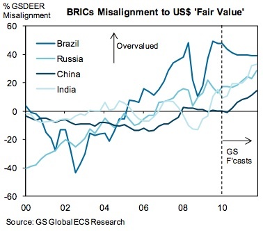 Аналитики Goldman Sachs вчера выпустили обзор, в котором назвали все валюты стран BRIC переоцененными, за исключением китайского юаня. Валюта Китая, по их мнению, просто оценена справедливо, но в ближайшие пару лет также перейдет в разряд дорогих. При этом эксперты считают, что рубль и другие валюты BRIC продолжат дорожать по мере роста экономик этих стран.