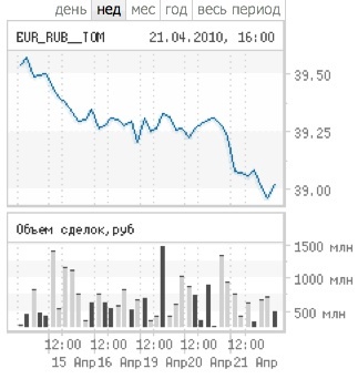 Снижение евро началось с утра. К падению ниже уровня 39 руб. привело резкое движение евро на мировом рынке во второй половине дня - с $1,344 до $1,336. "Наложились друг на друга технические причины, а именно пробитие важных уровней, и фундаментальные - страхи насчет ситуации с Грецией", - объясняет начальник управления операций на валютном рынке банка “Открытие” Петр Неймышев. Минимальное значение составило 38,9405 руб., ближе к завершению торгов курс немного восстановился - до 39,02 руб.