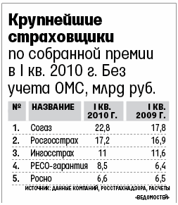 Сборы группы «Инго» (12,7 млрд руб. без ОМС) оказались на 3% ниже показателя прошлого года, а премии «Ингосстраха» (11 млрд руб.) – на 8% ниже. «Объем рынка в 2010 г. упадет, мы с коллегами лишь спорим, насколько именно», – рассуждал недавно гендиректор «Ингосстраха» Александр Григорьев. «Альфастрахование» сократило премии на 9% до 6,1 млрд руб., даже с учетом премий купленной в прошлом году группы «Авикос-АФЕС». Сокращение, рассказала заместитель гендиректора «Альфы» Татьяна Пучкова, в основном связано с уходом крупных клиентов – «Холдинга МРСК» и ФСК ЕЭС – в «Согаз», из-за чего премии по страхованию имущества снизились на 34%. Прибыль компании в I квартале – 201 млн руб.