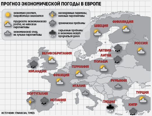На опубликованной FT карте «прогноза экономической погоды в Европе» за май (рассчитана на основе реального ВВП, прогнозов ВВП и уровня безработицы на этот и будущий годы) ситуация в еврозоне выглядит неоднородно. С декабря 2008 г., когда была опубликована предыдущая карта, ситуация улучшилась до «временами облачно» (хорошие перспективы) в основном в странах, пользующихся национальными валютами, – России, Дании, Великобритании, Чехии, Швейцарии, Турции. В Греции декабрьская «гроза» (неожиданные перемены) переросла в майский «снег» (серьезные проблемы). «Гроза» – в Португалии, «дождь» (хронические проблемы) – в Ирландии, Латвии, Литве, Испании, на Кипре. В Германии, Франции, Нидерландах, Бельгии, Австрии, Словакии – «временами облачно». По оценкам Еврокомиссии, экономика еврозоны вырастет в этом году на 0,9%.