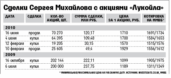 Большинство сделок Михайлова удачны. В октябре 2009 г. он купил акции «Лукойла» по 1098 руб., хотя на ММВБ они тогда стоили 1905–1975 руб. В феврале 2010 г. акции были проданы по 1929 руб. при биржевых ценах 1550–1600 руб.