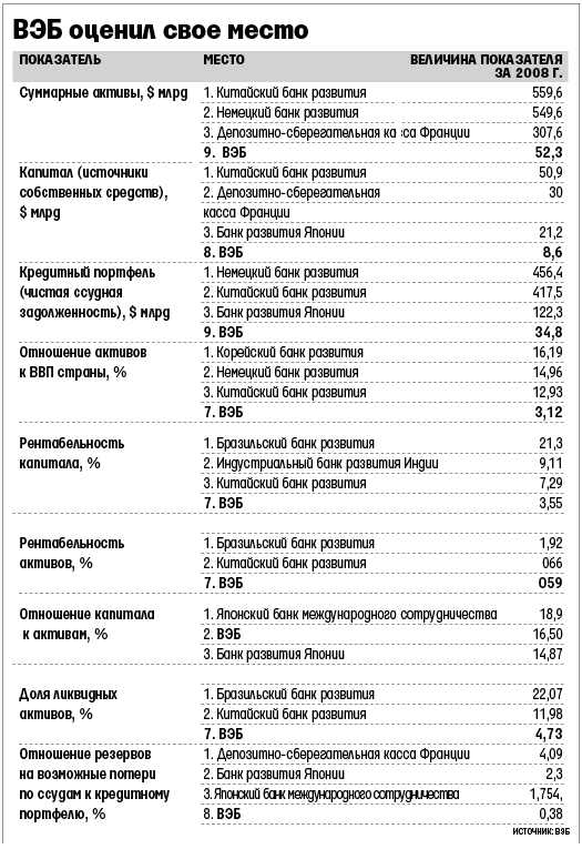 В окончательный список попали 10 институтов развития с суммарной стоимостью активов не менее $30 млрд (см. таблицу): Китая, Германии, Кореи, Бразилии, Японии (два банка), Испании, Индии, Франции и сам ВЭБ. По этому показателю ВЭБ занял девятое место – его активы в 2008 г. были в 10 раз меньше, чем у лидера – Китайского банка развития ($559,6 млрд). Он был акционирован накануне кризиса и увеличил стоимость активов более чем на $200 млрд, говорится в докладе.