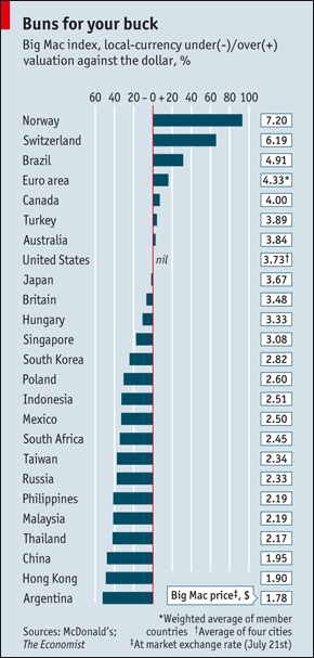 Рубль недооценен к доллару примерно в 1,6 раза, показал обновленный индекс бигмака журнала The Economist, рассчитываемый на основе цены стандартного гамбургера в ресторанах McDonald's в разных странах. Рядом с Россией в списке стран, валюты которых имеют потенциал укрепления, стоят в основном страны Юго-Западной Азии: Тайвань, Филиппины, Малайзия и Таиланд. В России за бигмак в этом году просят $2,33 по сравнению с $3,73 в США, так что курс российской валюты по паритетной покупательной способности выходит около 19 руб. за доллар. Дороже всего закрытый бутерброд с мясной котлетой стоит в Норвегии, а дешевле всего - в Аргентине.