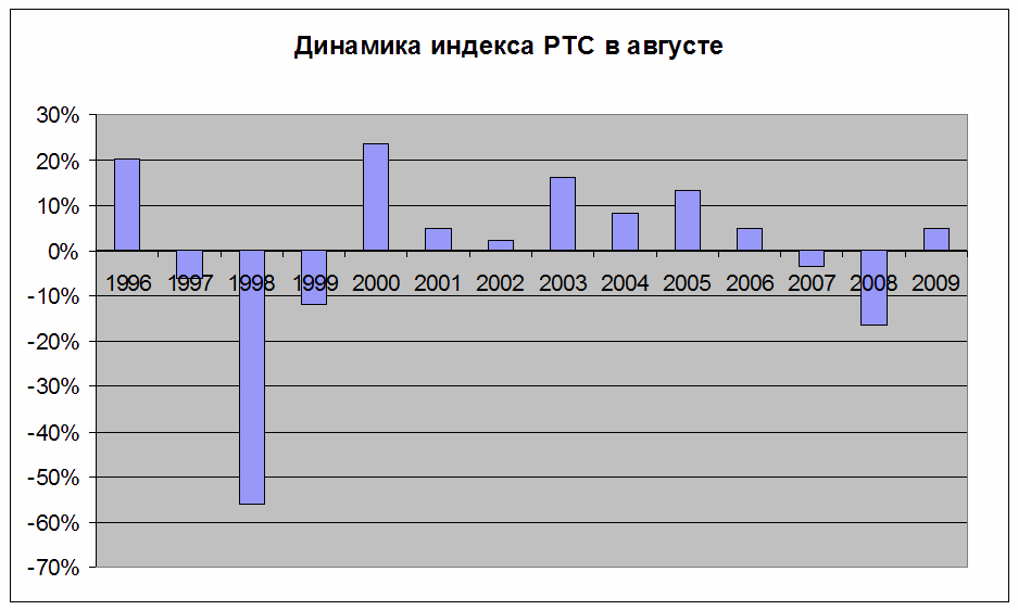 Как правило, исторически в августе рынок демонстрирует умеренный рост – с 1996 г. в среднем за этот месяц индекс РТС подрастал на 6,3%, рассказывает аналитик «Тройки диалог» Андрей Кузнецов. Это без учета кризисных августов 1998 и 2008 гг., когда на рынке наблюдались серьезные падения – на 56% и 16%, отмечает он.