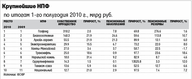 Позиции в десятке лидеров по количеству участников НПО за полгода мало изменились (см. таблицу на сайте), практически у всех НПФ колебания в пределах 2%, говорит гендиректор Pensiamarket.ru Радик Даутов. НПО могут себе позволить только финансово состоятельные предприятия, а они практически все и так имеют пенсионные программы, полагает Угрюмов. Крупнейший НПФ «Газфонд», в активах которого пенсионные накопления традиционно составляли незначительную долю (на начало года — 1,47%), за полугодие увеличил число клиентов по ОПС на 31,5%, повысив их долю в активах сразу до 2,45%.
