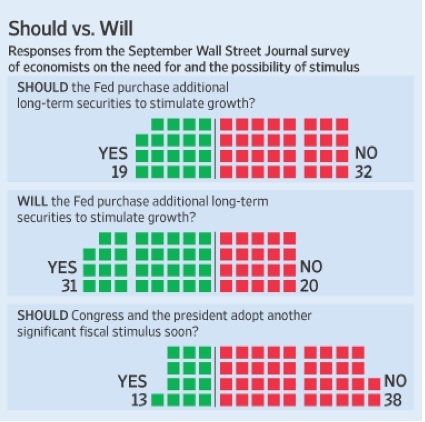 Средняя оценка вероятности повторной рецессии в течение ближайшего года — 22%. Несмотря на вероятное замедление роста, экономисты прогнозируют снижение уровня безработицы до 8,9% к концу следующего года, по итогам августа она составила 9,6%. По мнению экспертов, в течение года в экономике появится 1,66 млн новых рабочих мест, а проблемы на рынке труда носят не системный, а циклический характер. Вероятность победы республиканцев на ближайших выборах в конгресс в связи с падением доверия к администрации Обамы экономисты оценивают как позитивный фактор для рынка акций. Но рост может оказаться краткосрочным — конгресс не способен справиться с экономикой вне зависимости от того, у кого большинство, считает Николя Перна из Perna Associates.