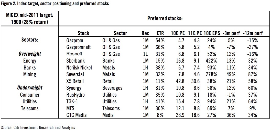 Среди CEEMEA в будущем аналитики ждут от российского рынка лучшую динамику, цель на середину 2011 г. сохраняется прежняя - 1900 пунктов по индексу ММВБ. Потенциал роста к текущему уровню — 28%. Хотя это может показаться амбициозной целью, но ее достижение предполагает небольшую переоценку рынка по коэффициенту P/E (стоимость к прибыли) — с 5,8 до 6,2, учитывая рост доходов компаний на 20% за этот период, отмечают в Citi. Эксперты выделяют акции «Газпрома», «Роснефти», «Норильского никеля», Сбербанка, «Северстали», «Русгидро», Х5 и «Синергии».