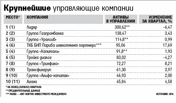 Активы крупнейшей частной УК – «Лидер», известной консервативным подходом к инвестированию, снизились сразу на 6,47% за квартал. Гендиректор «Лидера» Анатолий Гавриленко уменьшение портфеля на 20,8 млрд руб. комментировать не стал, у агентств информации об этом тоже нет. Представитель НПФ «Газфонд», основного клиента «Лидера», также ничего сказать не смог.