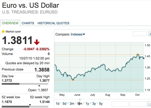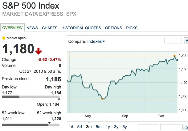 Перегретые рынки восприняли эту оценку как отрезвляющий фактор — доллар дорожал до $1,377 за евро (сейчас около $1,3822), на ММВБ - до 30,7286 руб. Фьючерсы на американские индексы сегодня снижались, нефть WTI подешевела примерно на 1,6% до $81,2. Торги в США открылись снижением основных индексов на 0,4-0,8%, индекс ММВБ снизился на 1,17% до 1 507,05 пункта.