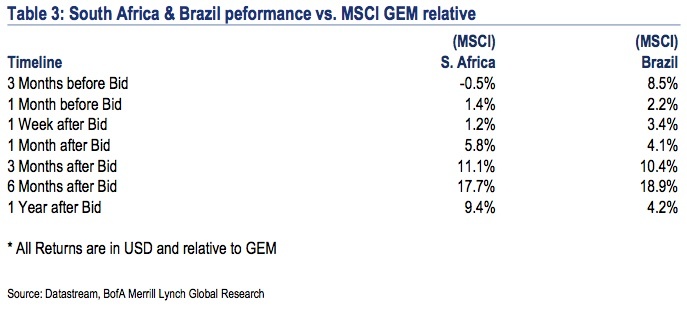 По данным ML, фондовые рынки Бразилии и ЮАР, также принимавших чемпионат мира, росли опережающими темпами относительно BRIC после победы в конкурсе. Аналитики "Тройки диалог" также вспоминают ситуацию в этих странах, предвидя реакцию рынка уже в ближайшее время: "Победа российской заявки в конкурсе на право провести чемпионат мира по футболу в 2018 г. вполне способна стать катализатором предновогоднего ралли: это событие, возможно, заставит инвесторов поверить, что ситуация в стране действительно улучшается".