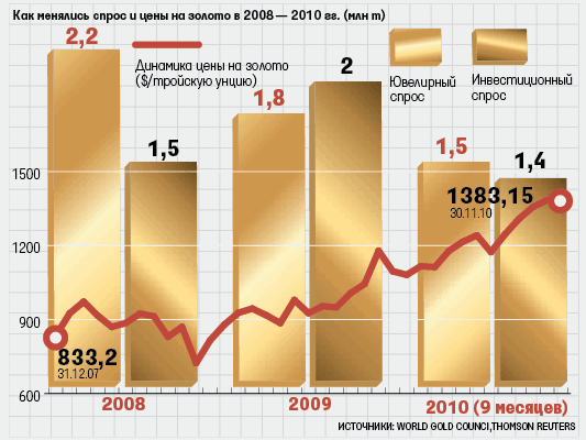 Структура спроса на золото начала меняться в кризис. По данным World Gold Council, в 2009 г. инвестиционный спрос составил 1959 т, а ювелирный – 1759 т. Во II квартале спрос ювелиров снизился на 18% по сравнению с I кварталом, в III квартале – вырос на 25% к уровню II квартала. Но этот спрос поддержали несколько стран: Китай, Турция, Россия и Гонконг, где украшения рассматриваются как инвестиция, пишет World Gold Council, в других странах спрос на украшения из золота падает.