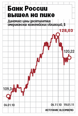 Время для сделки ЦБ выбрал очень удачно. Федеральная резервная система США (ФРС) 3 ноября объявила второй раунд «количественного смягчения», предполагающий в течение восьми месяцев выкуп гособлигаций на $600 млрд. Решение ФРС было воспринято неоднозначно, многие аналитики опасались, что оно может стимулировать инфляцию и еще больше обесценить бумажные деньги в результате безостановочной работы печатного станка. В результате цены американских гособлигаций пошли вниз, а доходности – вверх. В начале ноября 10-летние бумаги стоили 128% от номинала, а их доходность была на уровне 2,6% годовых, вчера – 120,24 и 3,35% соответственно. Таким образом, цены снизились примерно на 6%, т. е. за это время $7-миллиардный пакет подешевел бы примерно на $440 млн.