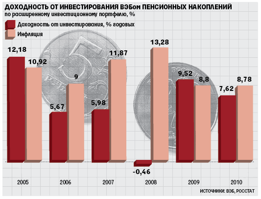 Доходность инвестирования средств пенсионных накоплений по расширенному портфелю ВЭБа за 2010 г. составила 7,62%, а по консервативному портфелю, состоящему из госбумаг, – 8,17%, сообщил директор департамента доверительного управления ВЭБа Александр Попов. Инфляция за 2010 г. составила 8,8%. За три последних года доходность расширенного портфеля – 5,47% (по консервативному портфелю такая статистика не ведется – он был создан в ноябре 2009 г.).