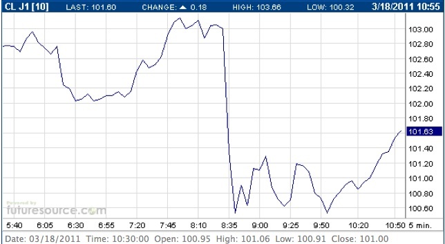 После роста в пятницу выше $103 за баррель WTI котировки нефтяных фьючерсов резко упали ниже отметки $101 — так рынок отреагировал на заявление министра иностранных дел Ливии о признании страной резолюции ООН и прекращении боевых действий на своей территории. До этого момента цены росли в ожидании воздушных ударов по Ливии, которые стали возможны после принятия ночью в пятницу Советом безопасности ООН резолюции 1973 о бесполетной зоне над страной и защите ее гражданского населения.