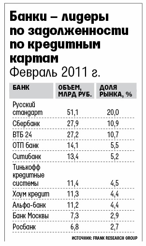 По итогам февраля Сбербанк по объему задолженности по кредитным картам обошел «ВТБ 24» и занимает 2-е место, подсчитала консалтинговая компания Frank Research Group (см. таблицу). Рыночная доля Сбербанка достигла 10,9%. У «Русского стандарта» – 20%. Но Сбербанк идет семимильными шагами – с начала 2010 г. его «карточный портфель» устойчиво растет на 1–1,5 млрд руб. в месяц. У «ВТБ 24» и «Русского стандарта» прирост за последние два месяца – по 1 млрд руб. У большинства других игроков рынка динамика вообще близка к нулю.