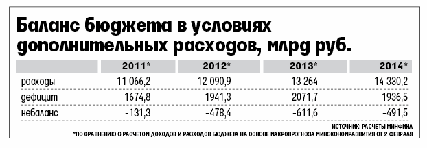Основным ресурсом для покрытия возрастающих расходов федерального бюджета станут условно утверждаемые расходы (которые закреплены в бюджете, но не распределены по разделам и статьям) – 419,3 млрд руб. в 2012 г. и 482 млрд руб. в 2013 г. Ведомство также попытается сократить субсидирование государством компаний – по 100 млрд руб. в ближайшие два года. Минфин исходит из медленного сокращения численности военнослужащих и уменьшения величины оборонного заказа, следует из материалов.