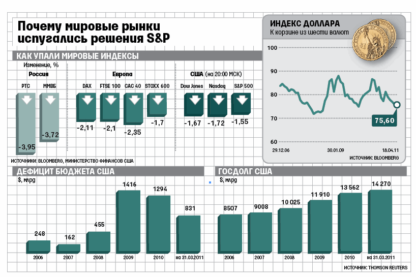 Фондовые рынки отреагировали на заявление S&P падением (см. инфографику). Американский фондовый индекс S&P 500 потерял 1,67% (на 20.00 МСК).