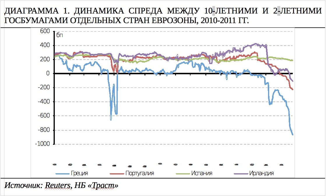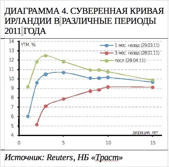 Наибольшее влияние спекуляции вокруг реструктуризации госдолга Греции оказали на долги Ирландии. Так, спред между 10-летними и 2-летними гособлигациями Дублина перешел в отрицательную зону в середине апреля 2011 г. Схожая ситуация (превышение ставок по коротким бумагам над ставками по долгосрочным) наблюдается и по долговым обязательствам Португалии. При этом рынки благосклонно относятся к Испании – спред между 10- и 2-летними бумагами с начала 2010 г. находится возле отметки в 200 б.п.