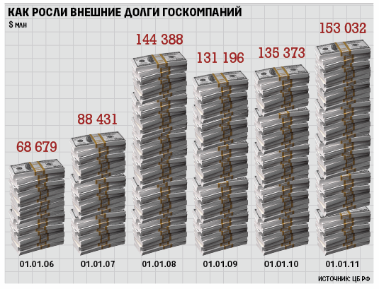 Резко займы росли в преддверии кризиса, сейчас они вернулись к докризисному уровню. В начале 2006 г. внешний долг госбанков и госкомпаний составлял $68,7 млрд, к 1 октября 2009 г. – $148,4 млрд, в начале 2010 г. – $128,8 млрд, к 1 января 2011 г. составлял, по данным ЦБ, около $150 млрд (частного сектора – $290 млрд).