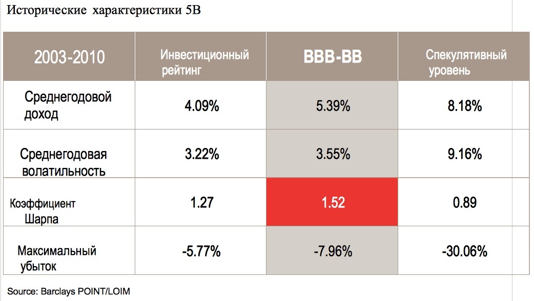 Если говорить об облигациях западных компаний, исторически категория 5В всегда представляла собой интересное соотношение риска и доходности. Годовой доход в данном сегменте в период между 2003 и 2010 гг. был выше, чем в сегменте бумаг инвестиционного уровня, но ниже, чем среди высокодоходных бумаг. Однако его волатильность была намного ниже, чем в высокодоходном секторе, и лишь немного выше, чем среди бумаг инвестиционного уровня. Таким образом, соотношение риск/доходность в категории 5В является оптимальным. Стоит также отметить, что максимальные потери по этим бумагам во время финансового кризиса (-8%) были значительно ниже, чем по бумагам с низким спекулятивным рейтингом (-30%). На наш взгляд, строгое разделение бумаг на инвестиционную и спекулятивную категории нелогично, и этим можно воспользоваться. Инвестиции в категорию 5В представляют собой прекрасную возможность увеличить доходность без существенного ущерба для качества или уровня риска портфеля.