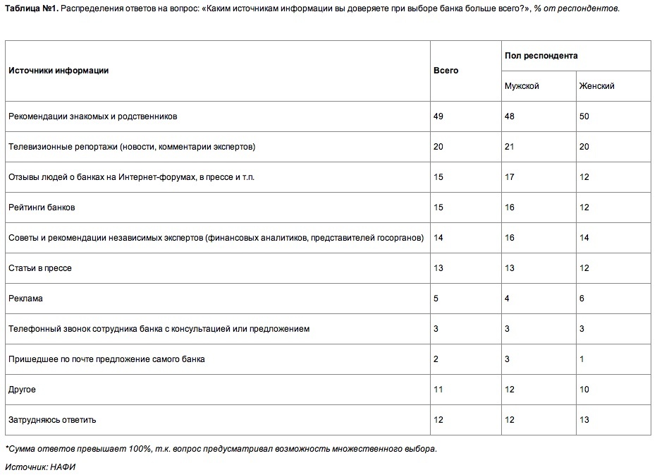 Как утверждают социологи, доверие мужчин и женщин основным источникам информации практически не различается. Исключение составляют отзывы на интернет-форумах и рейтинги банков - мужчины чаще ориентируются на эти данные. Чем выше уровень образования, тем выше доверие рейтингам банков, отзывам в интернете, а также советам экспертов, и ниже - рекомендациям родственников и знакомых.
