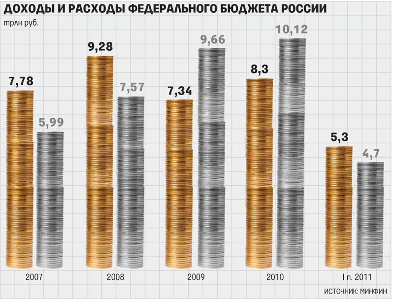 «Сколько денег вы заработали, сколько истратили? И сколько в кубышку положили? У нас профицит ведь, правильно?» – поинтересовался с ходу Путин (цитаты с government.ru). Бюджет исполнен с профицитом в 640,2 млрд руб., или 2,7% ВВП, отрапортовал Кудрин: доходы – 5,3 трлн руб. (51,5% плана), расходы – 4,7 трлн (42,3%). «В прошлом году у нас был дефицитный бюджет в это время», – напомнил он Путину.