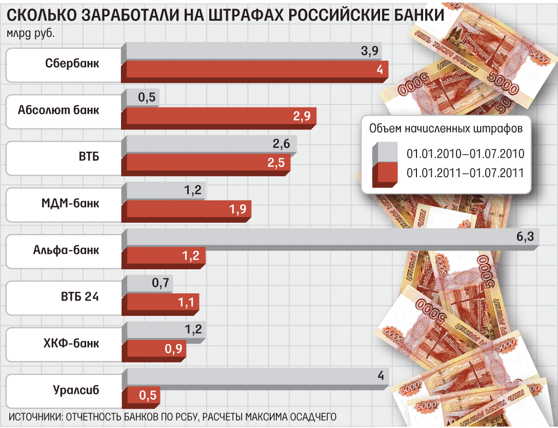 В этом году банки получили гораздо меньше доходов от взыскания штрафов с нерадивых клиентов. В лидерах госбанки и те, кто активно судится с должникамиВ первом полугодии 2011 г. российские банки записали себе в доходы 27,7 млрд руб. пеней, штрафов и неустоек, подсчитал начальник аналитического управления БКФ-банка Максим Осадчий. В прошлом году доход от штрафов был заметно больше – 35 млрд руб.