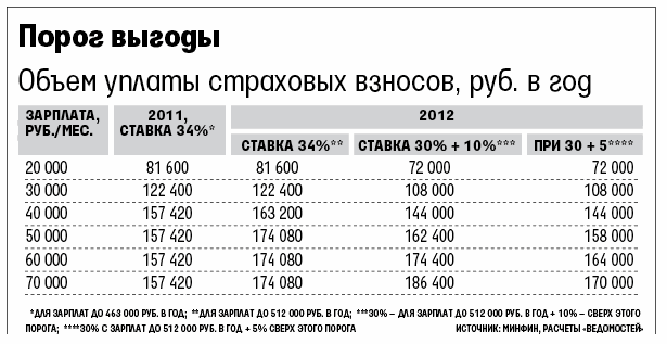 В докладе президенту правительство предложило вариант Минфина: 10% – ставка для зарплат, превышающих облагаемый взносами порог (в 2012 г. это 512 000 руб. в год), для малого бизнеса – 7%. По расчетам Минфина, мера компенсирует чуть более 40% потерь: 165,7 млрд из 391,4 млрд руб. в 2012 г. (копия доклада есть у «Ведомостей»).