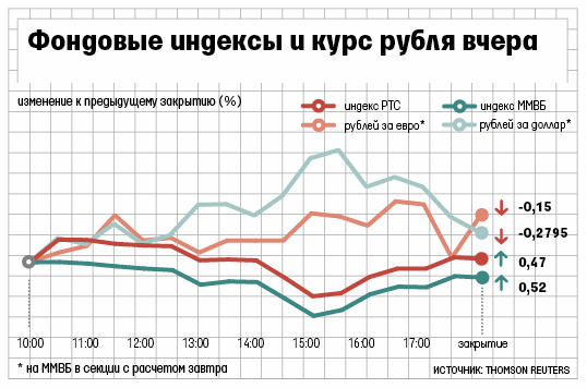 Торги на ММВБ открылись почти 3%-ным скачком котировок, несмотря на рухнувший накануне (-4,4%) индекс S&P 500 и падение рынков Азии. В полдень индекс устремился вниз, остановившись у 1350 пунктов – на 5% ниже, чем накануне. А закончил день на отметке 1438 пунктов, или +0,5% (см. график). Столько же прибавил и индекс РТС.