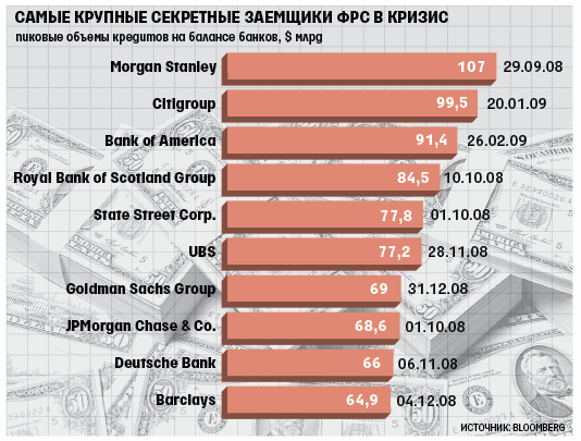 Десять крупнейших банков США, заработавших в 2006 г. рекордные $104 млрд прибыли, в 2008 г. были вынуждены взять у Федеральной резервной системы США (ФРС) взаймы $669 млрд по семи антикризисным программам, подсчитали эксперты Bloomberg. Долгое время эта информация оставалась секретной. Для сравнения: минфин США в кризис инвестировал в эти банки $160 млрд. Спрос на средства по программам ФРС достиг пика 5 декабря 2008 г. – в этот день на балансах банков было $1,2 трлн таких ссуд. Это почти втрое больше, чем дефицит федерального бюджета США в 2008 г., и больше совокупной прибыли банков, входящих в систему федерального страхования, за 2000–2010 гг. Предыдущий рекорд был зафиксирован на следующий день после терактов 11 сентября 2001 г. и составил $46 млрд. «Это колоссальные суммы, – говорит Роберт Лайтан, бывший сотрудник минюста США, расследовавший причины кризиса сберегательных и кредитных ассоциаций. – Речь о том, что финансовая аристократия США пошла бы на дно без денег ФРС» (цитата по Bloomberg).