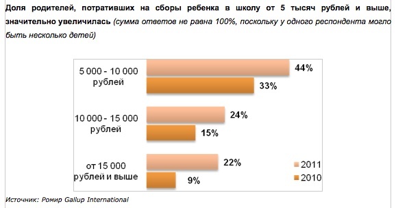 Расходы россиян на сборы детей в школу за минувший год выросли в среднем на 18%, утверждают аналитики исследовательского холдинга "Ромир", опросив накануне 1 сентября около 500 родителей из российских городов с населением свыше 100 000 человек во всех федеральных округах страны.