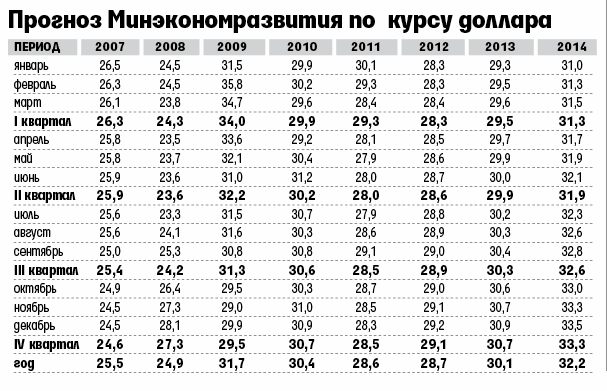 Курс рубля к доллару начнет снижаться одновременно с выборами президента – в марте следующего года, ожидает Минэкономразвития. Затем почти каждый месяц рубль будет сдавать по 10 коп. И в начале 2014 г. доллар в России станет стоить 31 руб. – на 11% больше предыдущего прогноза