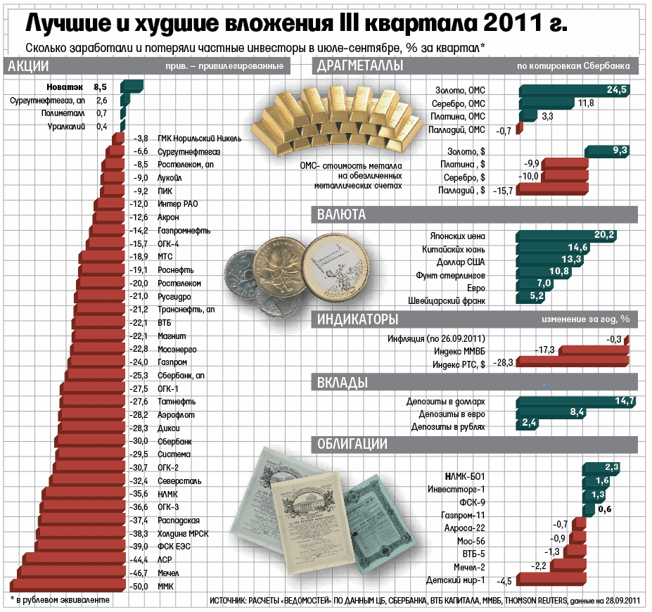 Несмотря на падение на финансовых рынках, некоторые инвестиции в июле – сентябре принесли неплохой доход: золото – 24%, а вклады в долларах – около 14%. Остальные инструменты принесли худший результат, а многие акции и вовсе подешевели на 20–50%