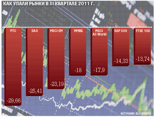 Прошедший квартал стал для российского рынка самым провальным с 2008 г., не спасли даже высокие цены на нефть. В IV квартале участники рынка ожидают небольшого подъемаРоссийские индексы начали IV квартал со снижения. Индекс ММВБ вчера просел на 1,6% до 1344 пунктов, РТС – на 3,6% до 1291 пункта. Большинство голубых фишек на ММВБ закрылось в минусе – «Газпром», «Лукойл», «Роснефть» и ВТБ подешевели в пределах 2%. Сбербанк просел на 3,1%. Всего за III квартал РТС и ММВБ потеряли 29,6 и 18% соответственно. Индекс MSCI Russia завершил квартал с результатом в минус 31%, потеряв на 5–10% больше всех других основных развивающихся рынков, отмечают аналитики «ВТБ капитала». Это худший квартал с 2008 г., говорят они: в сталелитейном секторе пять основных компаний потеряли половину капитализации, торговые сети, банки и электроэнергетика – примерно 40%, нефтегазовый сектор – четверть. Общемировой фондовый индекс MSCI All Country World потерял за квартал 17,9%, индекс развитых рынков MSCI World – 17,1%, индекс развивающихся рынков MSCI EM – 23,19%.