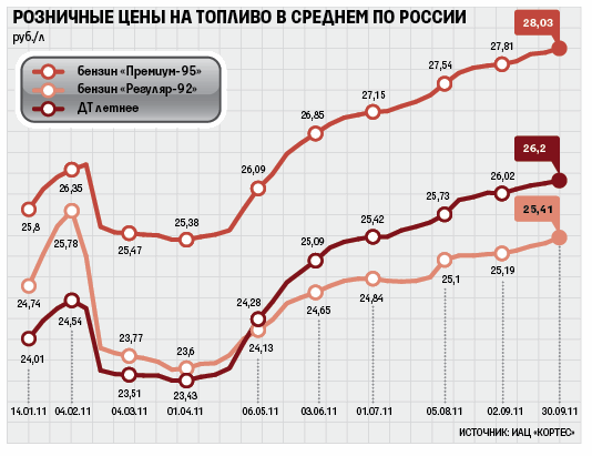 С начала года бензин в среднем по стране подорожал на 13,9% (при инфляции за этот же период в 4,7%), гласят данные Росстата. Но в течение месяца даже предлагаемых Минэнерго скачков цен более чем на 10% в среднем по стране не было. Максимальный рост зафиксирован с апреля по май (3,6%), когда в стране разразился топливный кризис: 10 регионов столкнулись с острой нехваткой топлива, а в 73 областях стоимость бензина росла опережающими темпами. Но в отдельных регионах рост стоимости бензина более чем на 10% случался. В Курске с 25 апреля по 3 мая цены взлетели на 20%, гласят данные Росстата. На нынешней неделе в Новосибирской области бензин подорожал на 11–17%. Весной правительство повысило экспортную пошлину на бензин для ликвидации дефицита. Баланс спроса и предложения топлива в стране восстановлен, уверял на днях «Ведомости» представитель Минэнерго.