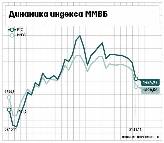 Фондовые рынки по всему миру снова падают: к уже ставшим привычными трудностям Европы добавились плохие новости из США. Российские индексы потеряли почти 5%, и участники рынка пока не видят просветаИндекс ММВБ вчера упал на 4,8% до 1390 пунктов, вернувшись к уровням месячной давности, когда рынок начинал восстанавливаться после обвала конца сентября – начала октября. РТС просел на 4,7% до 1424 пунктов. ВТБ, «Северсталь» и «Мечел» на ММВБ потеряли более 7% капитализации, «Газпром», «Роснефть» и Сбербанк – 5–6%.