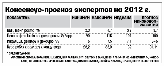 В 2012 г. экономика России замедлится, инфляция с середины года снова ускорится, а курс рубля переживет взлеты и падения, но в целом продолжит слабеть на фоне высоких цен на нефть, ожидают опрошенные «Ведомостями» экспертыБудущий год будет зеркальным отражением этого: тяжелое первое полугодие, а во втором ситуация улучшится, считает стратег «Тройки диалог» Крис Уифер. Европа продолжит искать выход из кризиса, что скажется и на настроении инвесторов, и на ценах на нефть – в первом полугодии они упадут ниже $100/барр., прогнозирует Владимир Тихомиров из ФК «Открытие». В I квартале курс евро к доллару достигнет годового минимума, а с ним и курс рубля, ожидает Юлия Цепляева из BNP Paribas. На этом фоне с учетом выборов президента курс в I квартале может упасть до 32–33 руб./$, считает Иван Чакаров из «Ренессанс капитала».